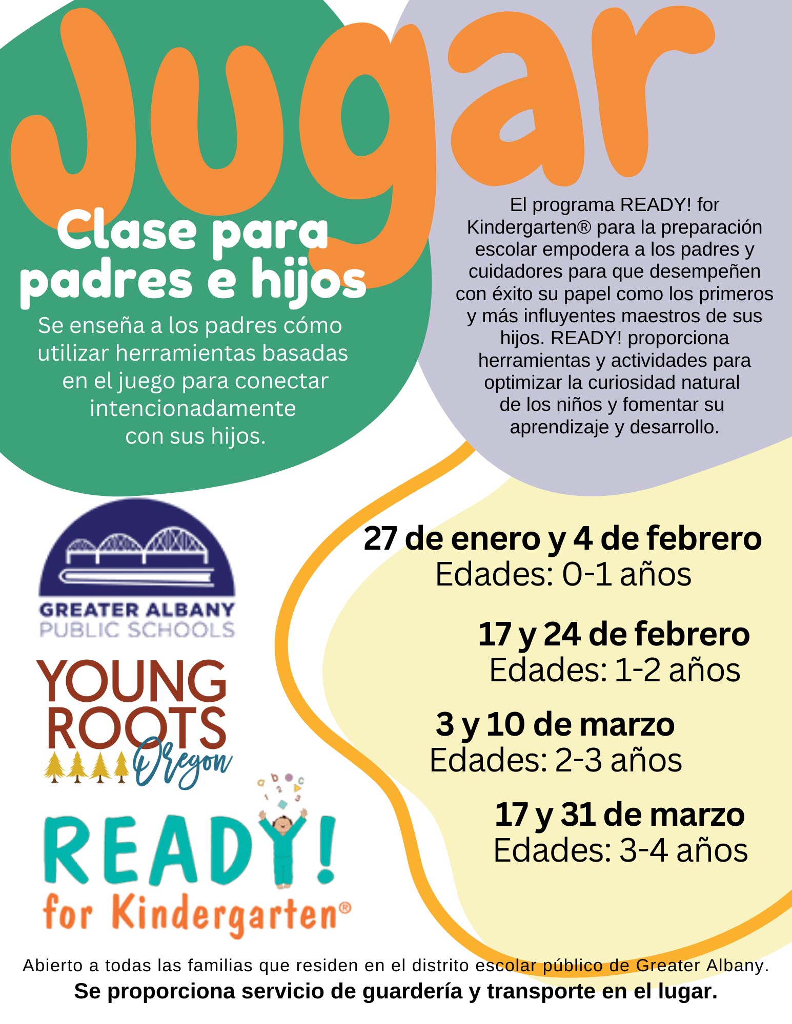 Abierto a familias que residan dentro del Distrito Escolar de Greater Albany Public Schools. Se ofrece cuidado infantil en el lugar y transporte.